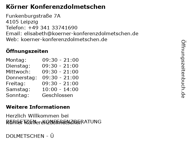 | Öffnungszeiten Körner Konferenzdolmetschen in Leipzig anzeigen | |