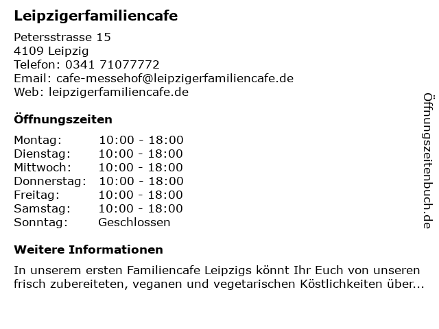 | Öffnungszeiten Leipzigerfamiliencafe in Leipzig anzeigen | |