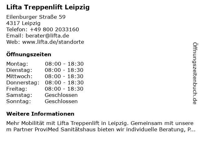 | Öffnungszeiten Lifta Treppenlift Leipzig in Leipzig anzeigen | |