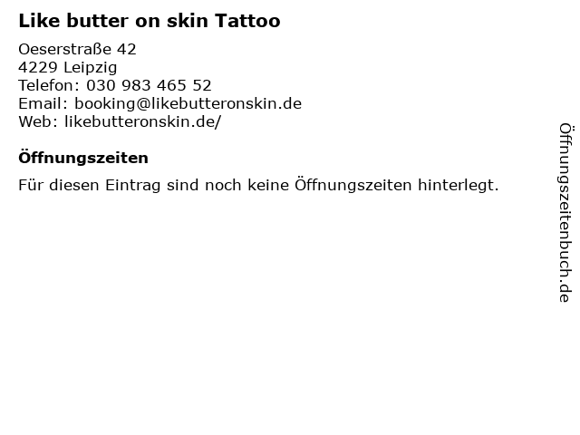 | Öffnungszeiten Like butter on skin Tattoo in Leipzig anzeigen | |