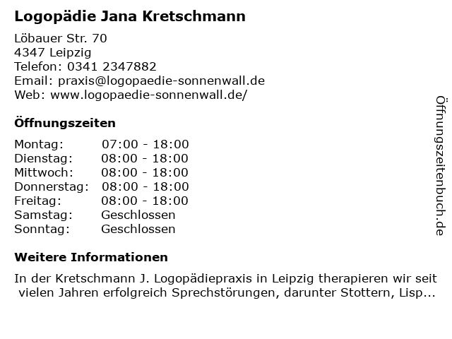 | Öffnungszeiten Logopädie Jana Kretschmann in Leipzig anzeigen | |