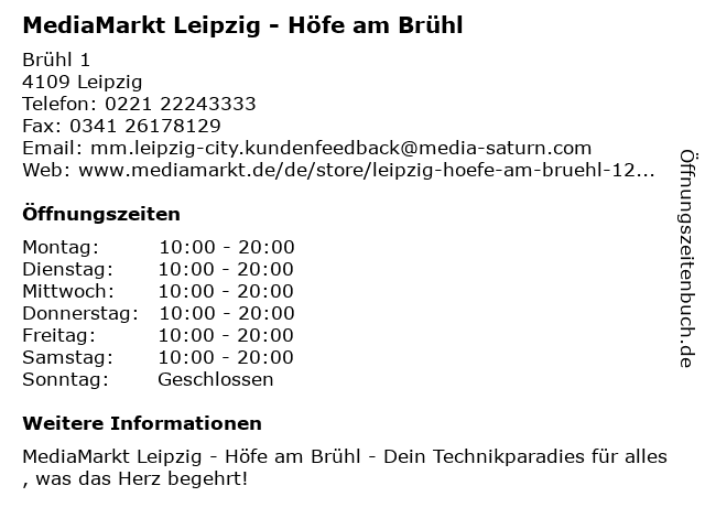 3 PicturePeople Fotostudio Leipzig | Zentrum Höfe am Brühl (Entfernung: 0,02 km) Brühl 1, 04109 Leipzig 5 MediaMarkt Smartbar Handy Reparatur Leipzig - Höfe am Brühl (Entfernung: 0,08 km) Brühl 1, 04109 Leipzig 6 |