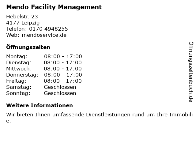| Öffnungszeiten Mendo Facility Management in Leipzig anzeigen | |