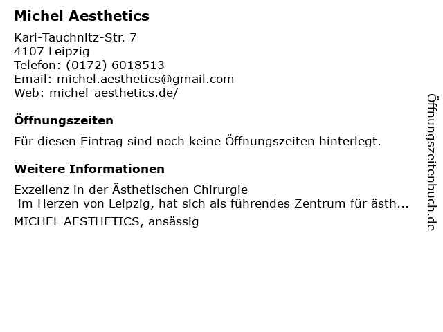 Öffnungszeiten Michel Aesthetics in Leipzig anzeigen | |
