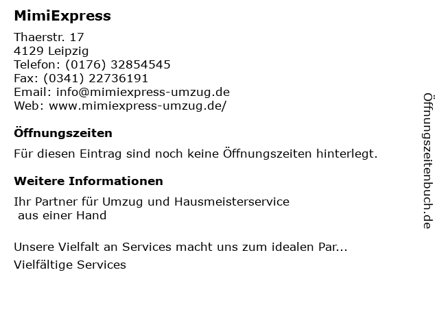 | Öffnungszeiten MimiExpress in Leipzig anzeigen | |