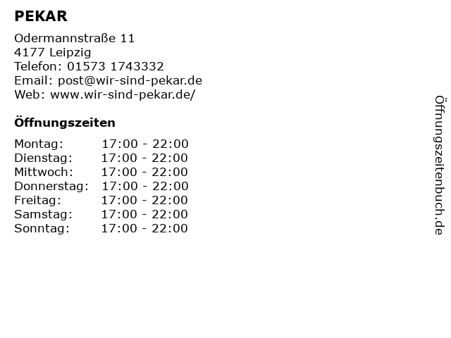 | Öffnungszeiten PEKAR in Leipzig anzeigen | |