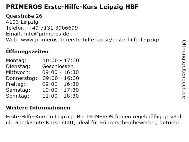 Branchen & Suchbegriffe zu PRIMEROS Erste-Hilfe-Kurs Leipzig HBF:erste, erste hilfe am unfallort, erste hilfe kurs, erste-hilfe, erste-hilfe-kurs, führerschein sehtest, hbf, herz-lungen-wiederbelebung, herzinfarkt, hilfe, kurs, primeros, schlaganfall, stabile seitenlage, verbandmaterial, weiterbildung |