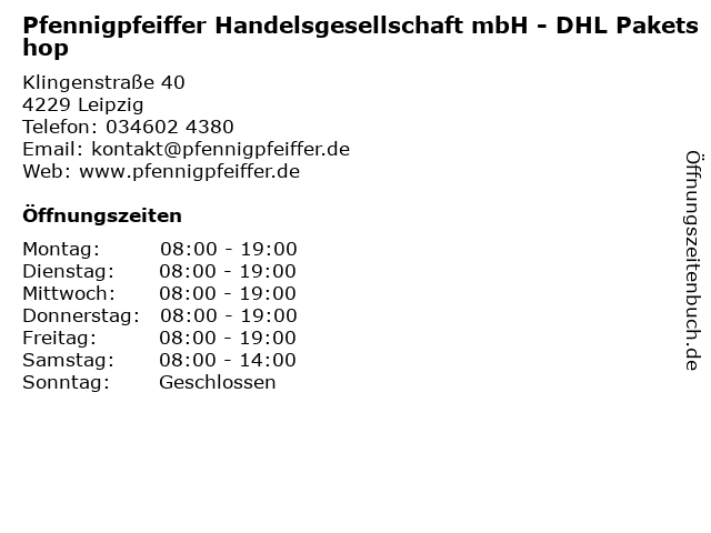 1 Pfennigpfeiffer Handelsgesellschaft mbH - DHL Paketshop (Entfernung: 10,37 km) Handelsstraße 10, 04356 Leipzig 6 |