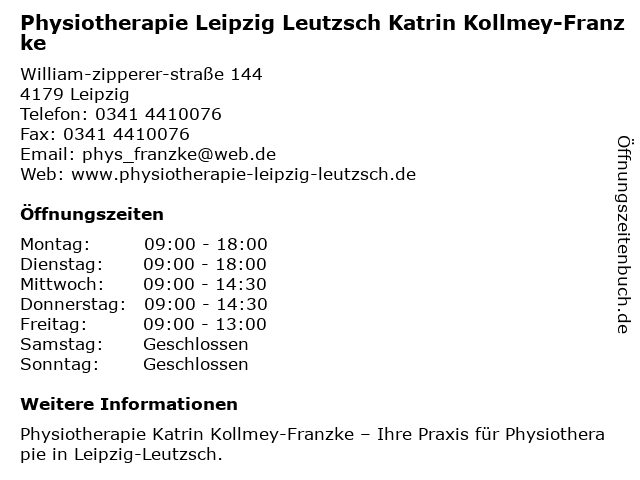 1 Physiotherapie Katrin Kollmey-Franzke (Entfernung: 0,01 km) William-zipperer-straße 144, 04179 Leipzig 6 |