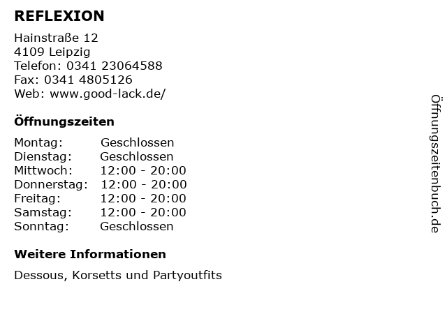 | Öffnungszeiten REFLEXION in Leipzig anzeigen | |