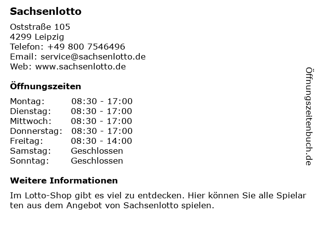 | Öffnungszeiten Sachsenlotto in Leipzig anzeigen | |