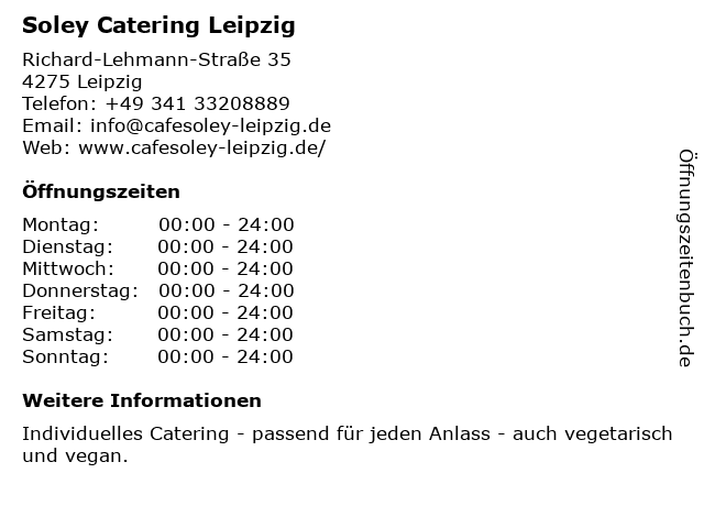| Öffnungszeiten Soley Catering Leipzig in Leipzig anzeigen | |