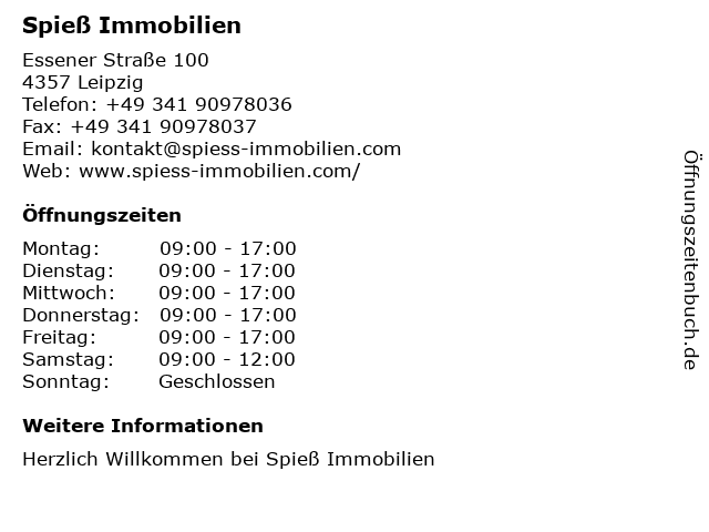 | Öffnungszeiten Spieß Immobilien in Leipzig anzeigen | |