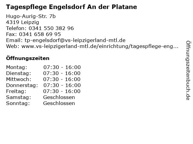 1 Sozialstation Engelsdorf An der Platane (Sprechzeiten) (Entfernung: 0,00 km) Hugo-Aurig-Str. 7b, 04319 Leipzig 4 Hort an der Grundschule Engelsdorf / Nebenstelle (Entfernung: 0,42 km) Engelsdorfer Straße 396, 04319 Leipzig 6 |