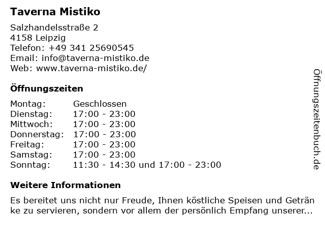 | Öffnungszeiten Taverna Mistiko in Leipzig anzeigen | |