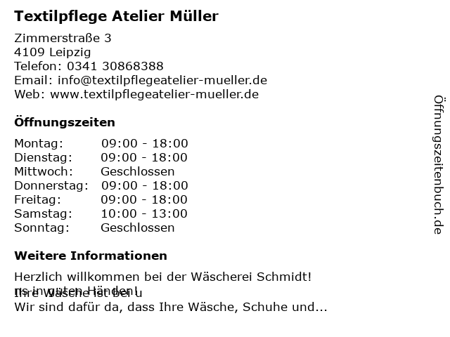 | Öffnungszeiten Textilpflege Atelier Müller in Leipzig anzeigen | |