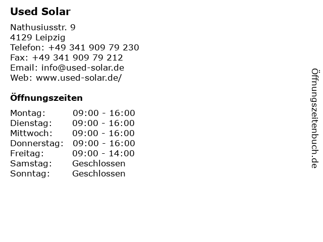 | Öffnungszeiten Used Solar in Leipzig anzeigen | |