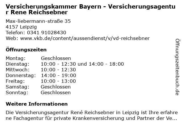 1 Versicherungskammer Bayern - Versicherungsagentur Rene Reichsebner (Entfernung: 0,01 km) Max-liebermann-straße 35, 04157 Leipzig 2 Versicherungskammer Bayern - Versicherungsagentur Julia Neu (Entfernung: 0,01 km) Max-liebermann-straße 35, 04157 Leipzig 4 Versicherungskammer Bayern - Consal VersicherungsDienste GmbH - Service Center (Entfernung: 4,20 km) Querstraße 18, 04103 Leipzig 5 DKV Service-Center Kohl & Partner Versicherungsagentur (Entfernung: 4,35 km) Querstr. 9, 04103 Leipzig 6 |