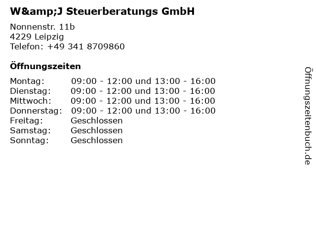 | Öffnungszeiten W&J Steuerberatungs GmbH in Leipzig anzeigen | |