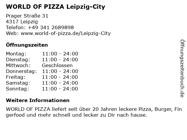 | Öffnungszeiten WORLD OF PIZZA Leipzig-City in Leipzig anzeigen | |