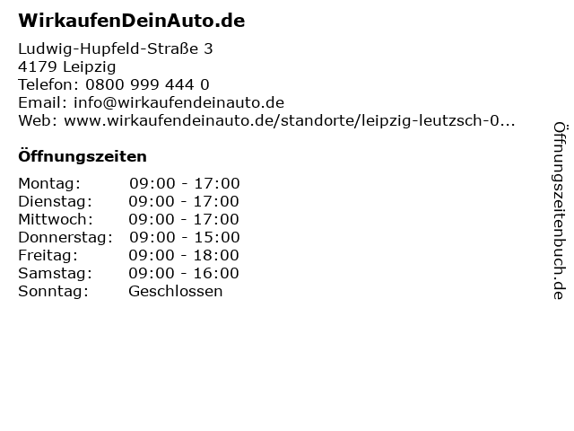 | Öffnungszeiten WirkaufenDeinAuto.de in Leipzig anzeigen | |