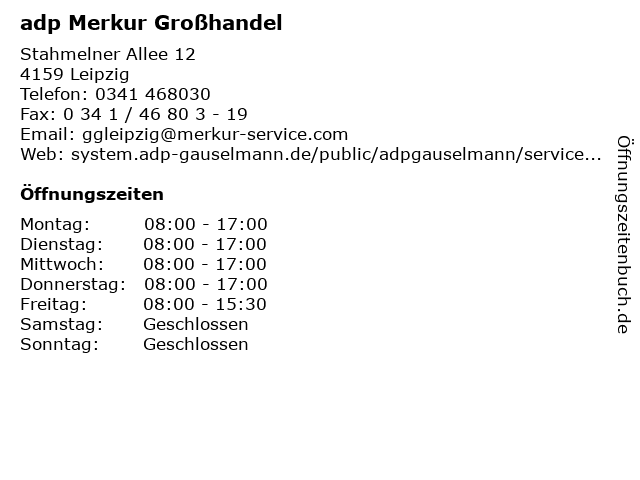 | Öffnungszeiten adp Merkur Großhandel in Leipzig anzeigen | |