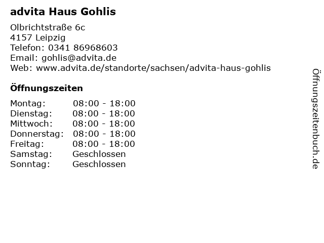 | Öffnungszeiten advita Haus Gohlis in Leipzig anzeigen | |