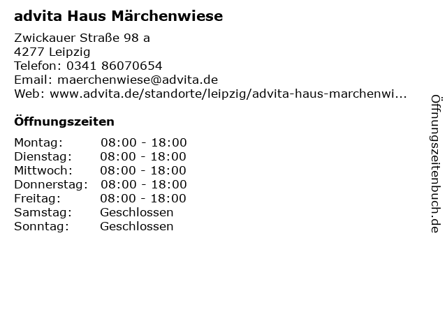 | Öffnungszeiten advita Haus Märchenwiese in Leipzig anzeigen | |