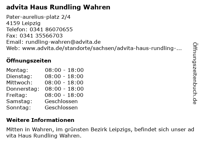 | Öffnungszeiten advita Haus Rundling Wahren in Leipzig anzeigen | |