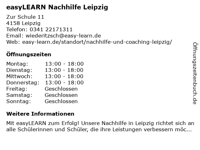 | Öffnungszeiten easyLEARN Nachhilfe Leipzig in Leipzig anzeigen | |