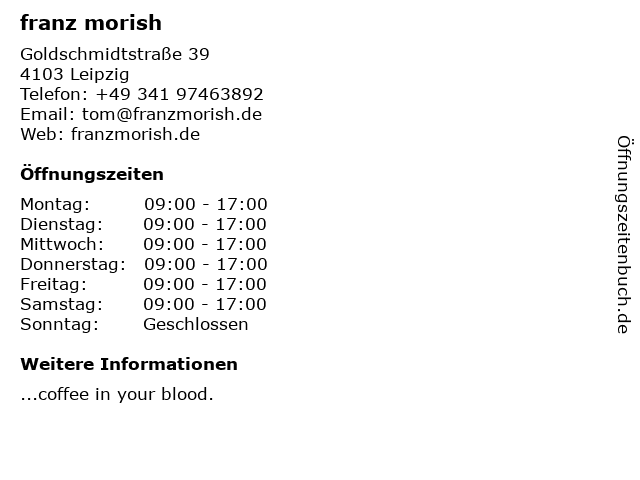 | Öffnungszeiten franz morish in Leipzig anzeigen | |