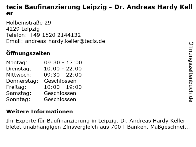 2 cb Finanzdienstleistungen Christine Böhmichen Baufinanzierung (Entfernung: 0,59 km) Oeserstr. 12, 04229 Leipzig 3 tecis Repräsentanz Kabis, Nicolai, Winkler & Kollegen (Entfernung: 0,82 km) Karl-heine-straße 20, 04229 Leipzig 6 |