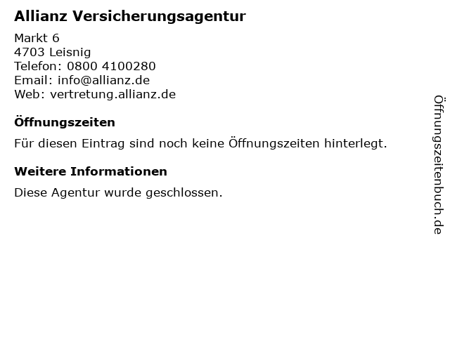 | Öffnungszeiten Allianz Versicherungsagentur in Leisnig anzeigen | |