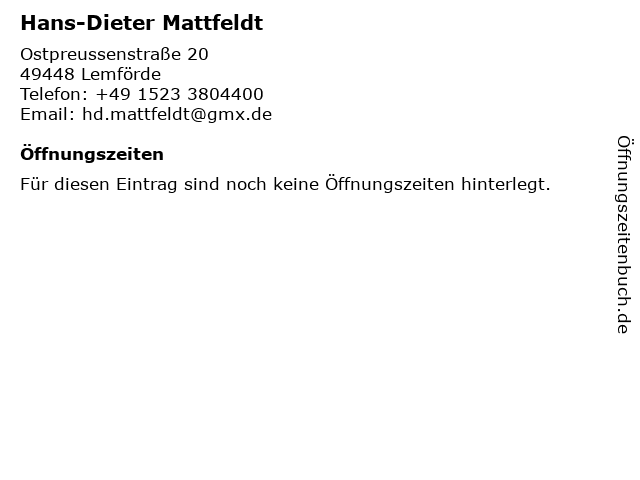 | Öffnungszeiten Hans-Dieter Mattfeldt in Lemförde anzeigen | |