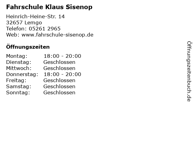 | Öffnungszeiten Fahrschule Klaus Sisenop in Lemgo anzeigen | |