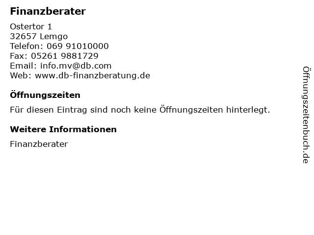 | Öffnungszeiten Finanzberater in Lemgo anzeigen | |