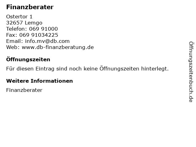 | Öffnungszeiten Finanzberater in Lemgo anzeigen | |