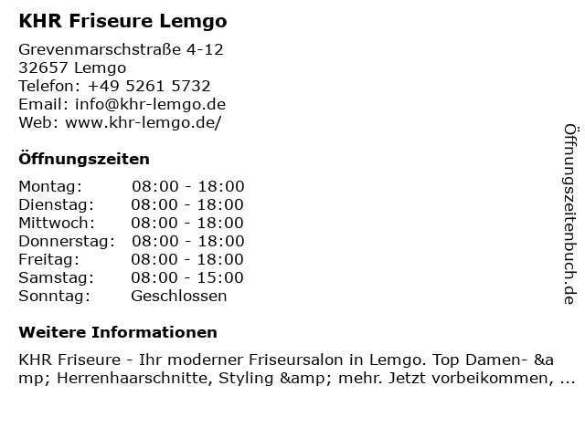 | Öffnungszeiten KHR Friseure Lemgo in Lemgo anzeigen | |