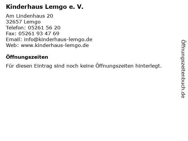 | Öffnungszeiten Kinderhaus Lemgo e. V. in Lemgo anzeigen | |