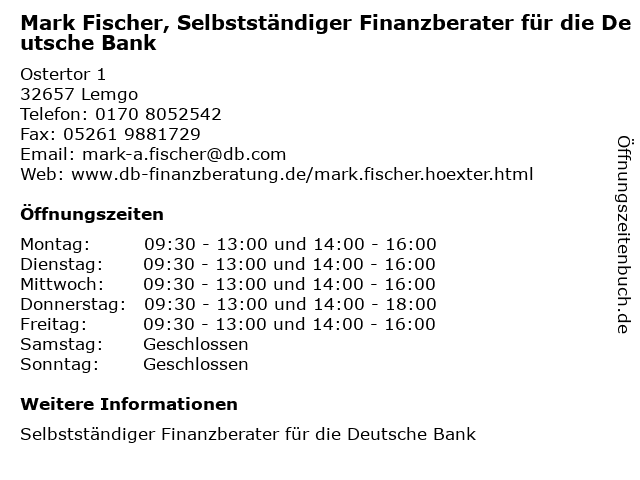 Branchen & Suchbegriffe zu Mark Fischer, Selbstständiger Finanzberater für die Deutsche Bank:bank, deutsche, finanzberater, fischer, mark, selbstständiger |