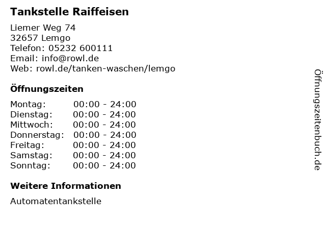 | Öffnungszeiten Tankstelle Raiffeisen in Lemgo anzeigen | |