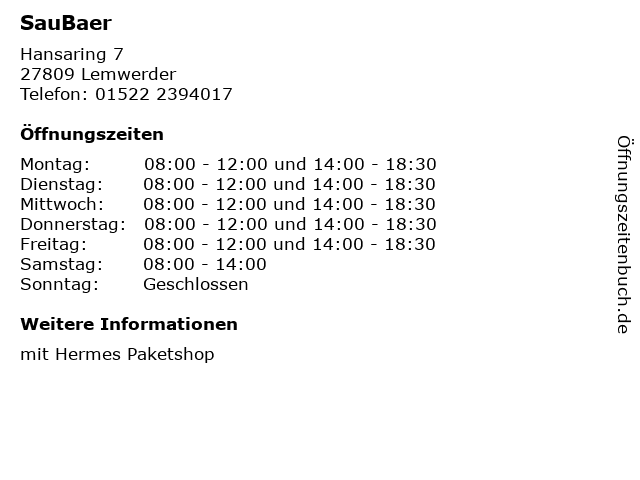 | Öffnungszeiten SauBaer in Lemwerder anzeigen | |