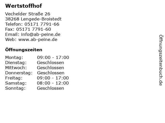| Öffnungszeiten Wertstoffhof in Lengede-Broistedt anzeigen | |