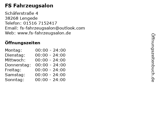 | Öffnungszeiten FS Fahrzeugsalon in Lengede anzeigen | |