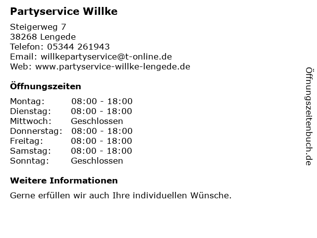 | Öffnungszeiten Partyservice Willke in Lengede anzeigen | |
