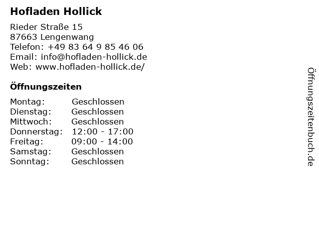 | Öffnungszeiten Hofladen Hollick in Lengenwang anzeigen | |