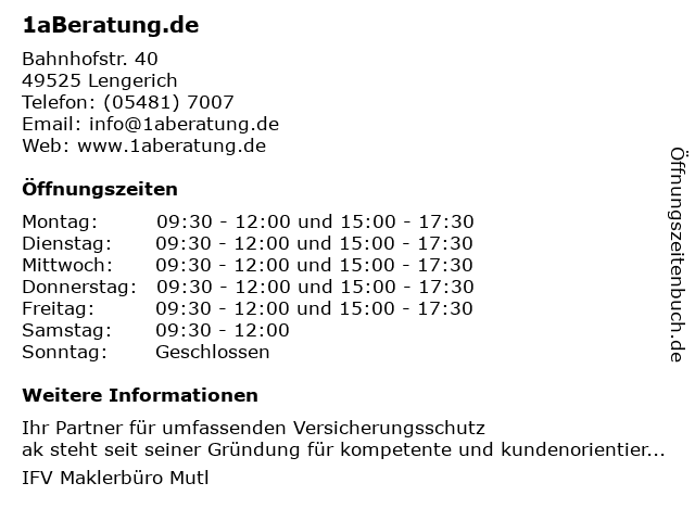 | Öffnungszeiten 1aBeratung.de in Lengerich anzeigen | |