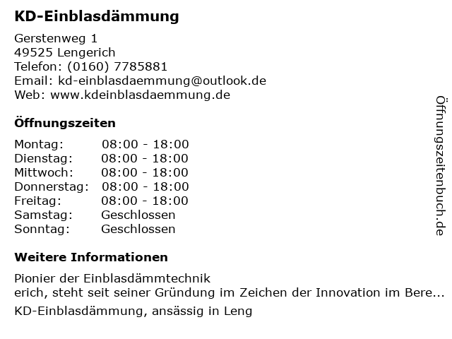 | Öffnungszeiten KD-Einblasdämmung in Lengerich anzeigen | |
