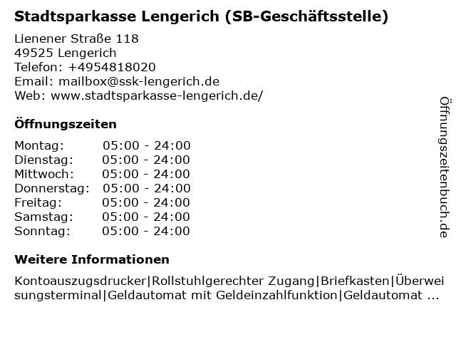 1 Kreissparkasse Steinfurt (SB-Geschäftsstelle) (Entfernung: 2,94 km) Ringeler Straße 17, 49525 Lengerich 2 SB-Center Hohne - Volksbank im Münsterland eG (Entfernung: 0,01 km) Lienener Straße 118, 49525 Lengerich 6 SB-Center Kattenvenne - Volksbank im Münsterland eG (Entfernung: 6,52 km) Bahnhofstraße 6, 49536 Lienen |
