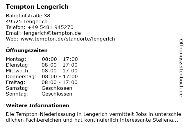 | Öffnungszeiten Tempton Lengerich in Lengerich anzeigen | |